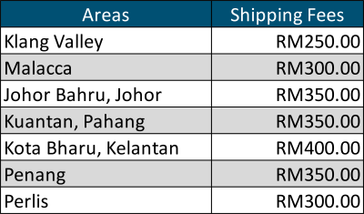 Our shipping rates varies by areas throughout West Malaysia. Rates are as follows;
